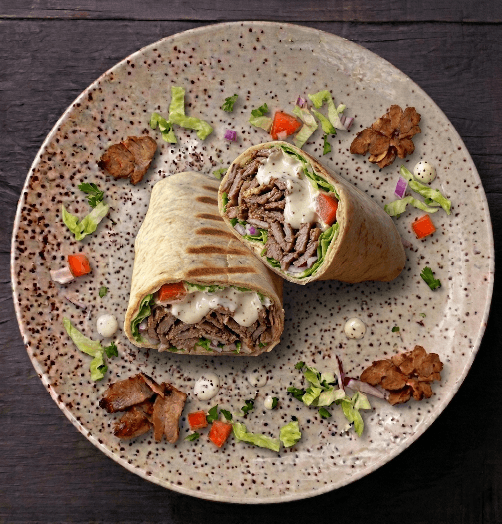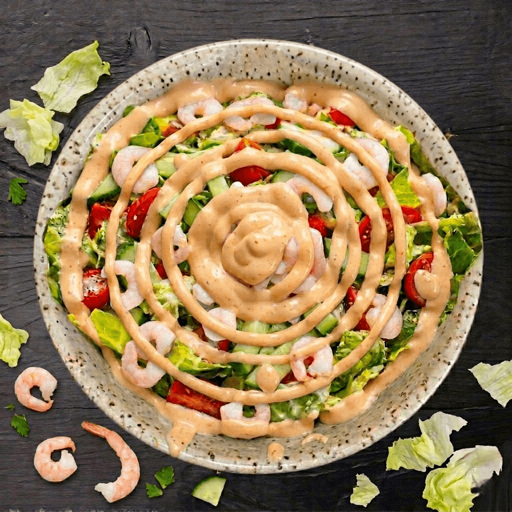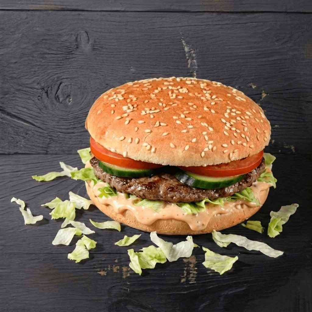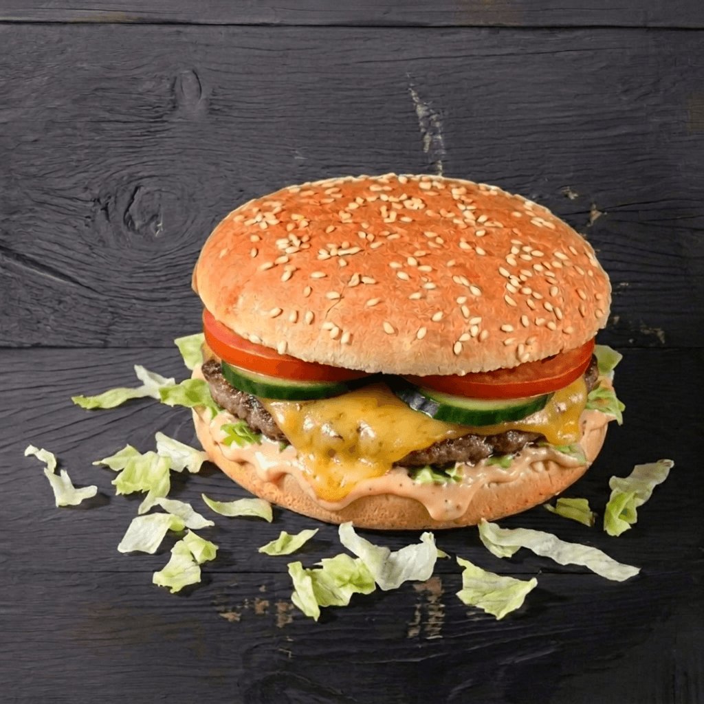 Brioche Bolli, Hakkibúffur 200gr, Salatmix, Tomato, Agurk, Leykur, Dressingur & Rustic Kips