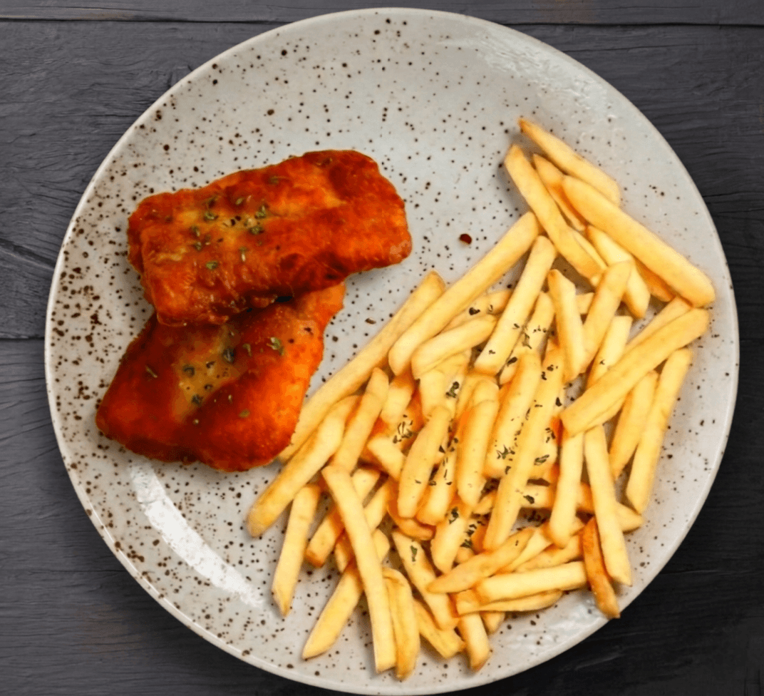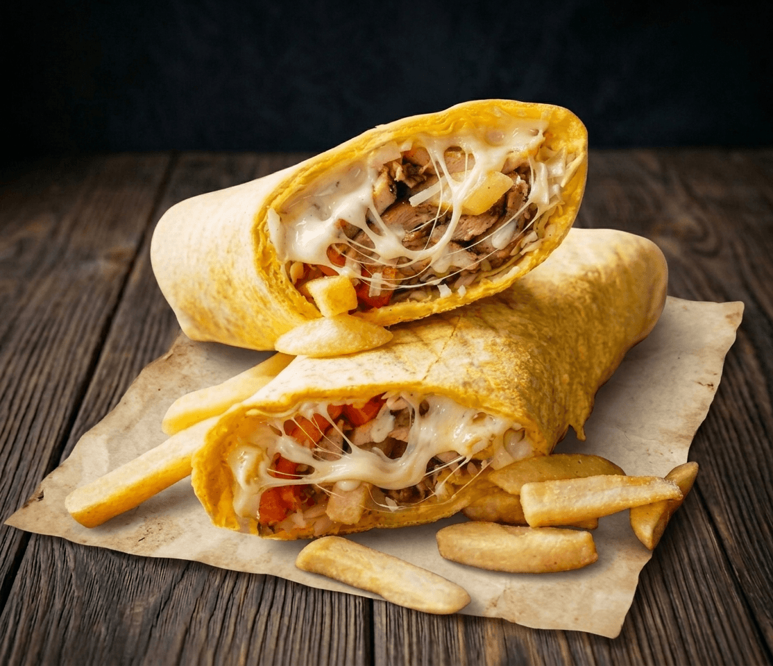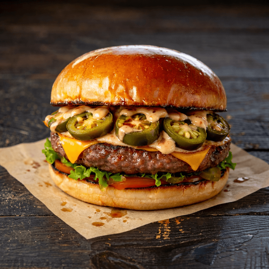 Brioche Bolli, Hakkibúffur 200gr, Cheddar Ostur, jalapenos, Chili, Tomato, Agurk, Leykur, Dressingur & Rustic Kips.