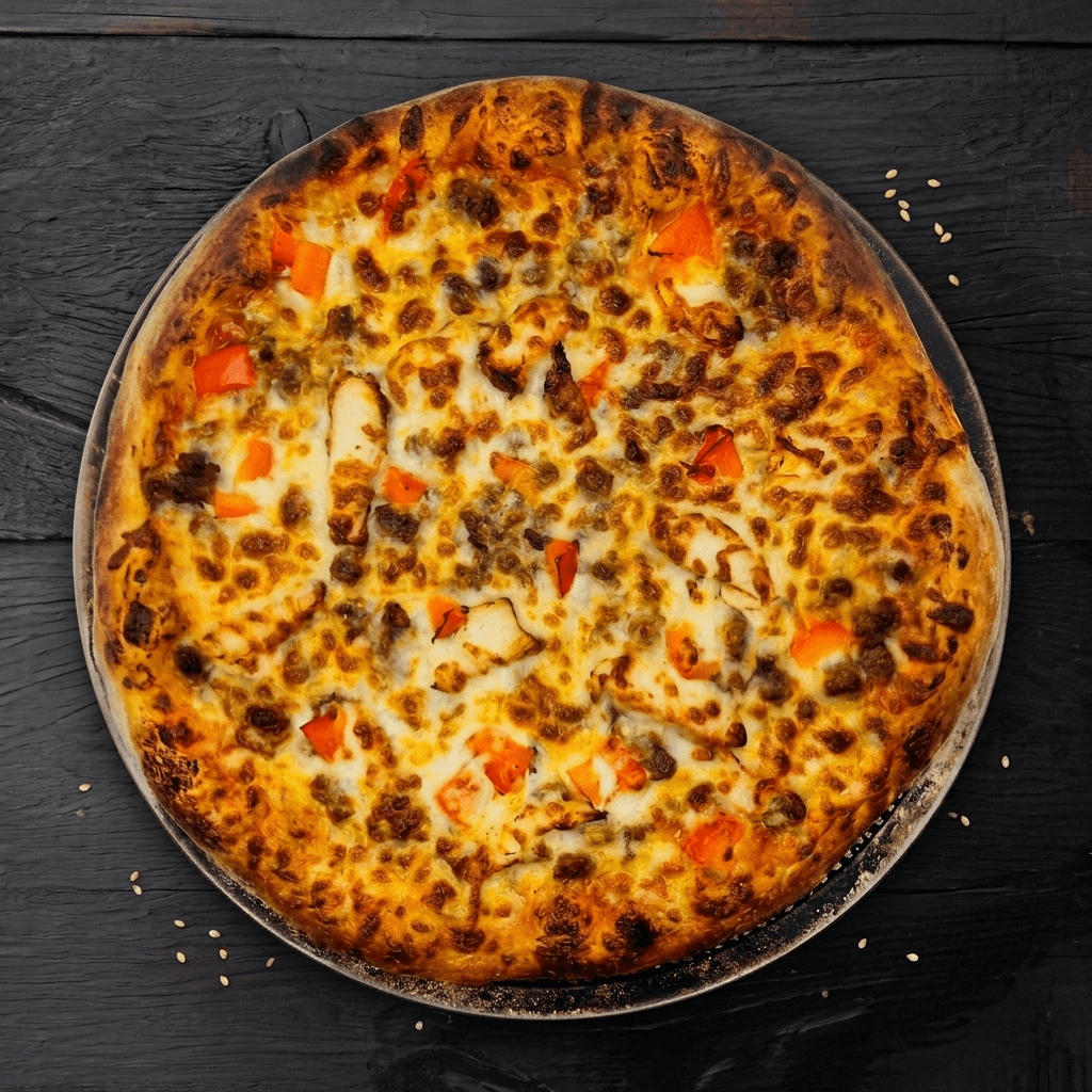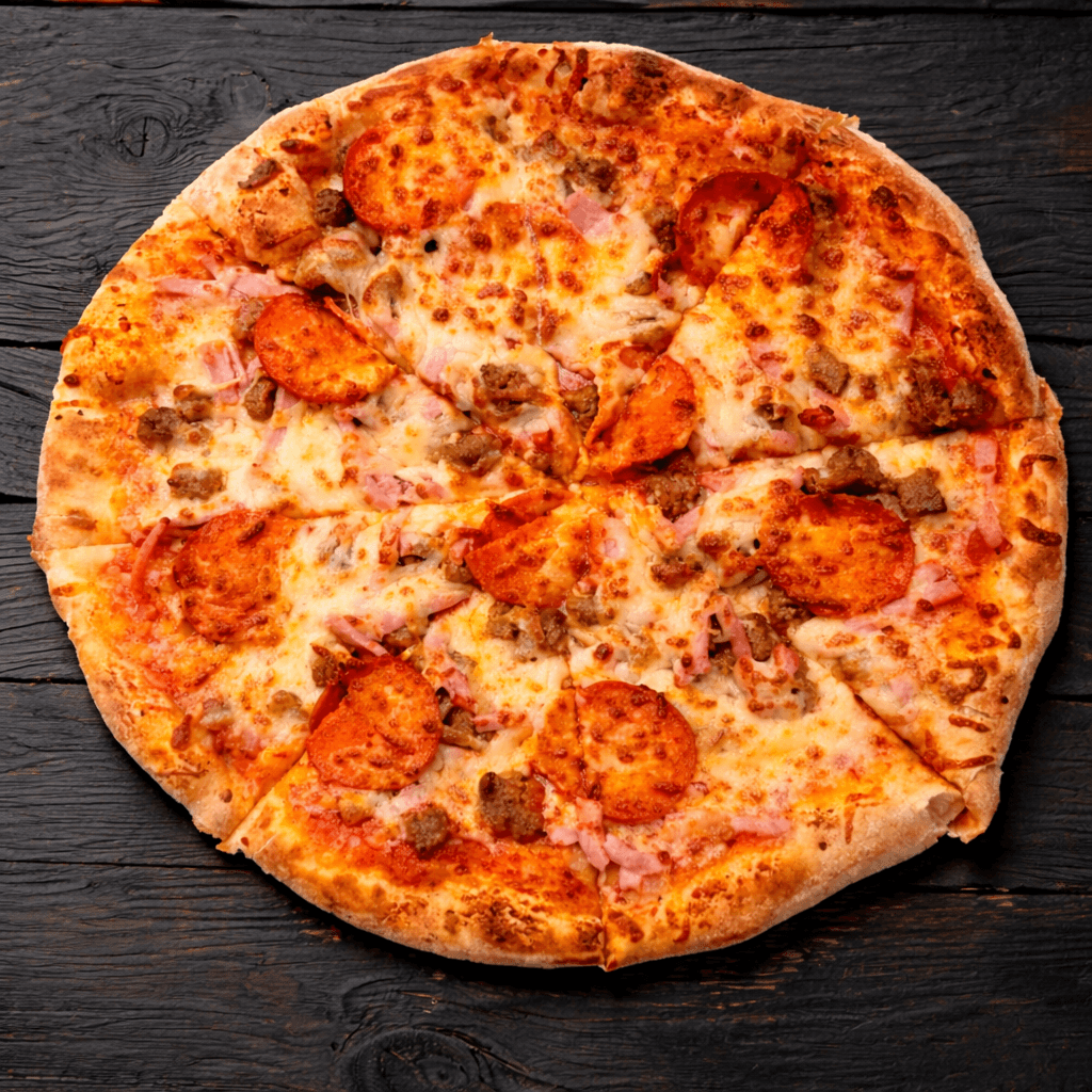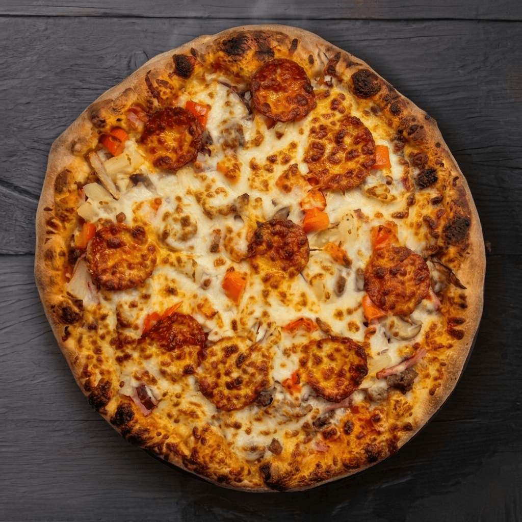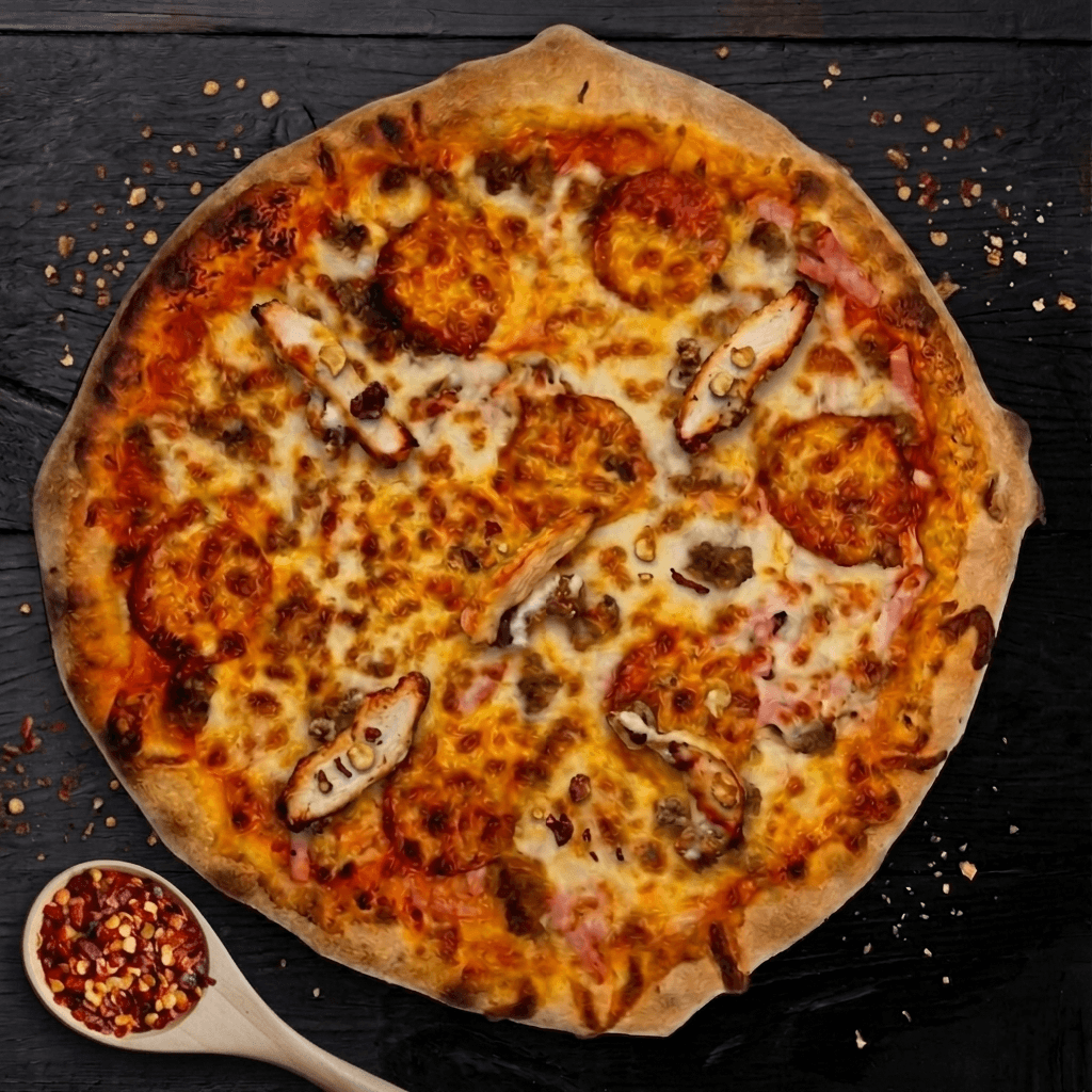 Ost, Tomatsós, Oksakjøt, Hvítleyksolja, Skinka, Høsnarungi, Pepperoni, Chil