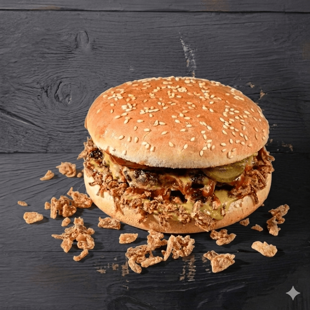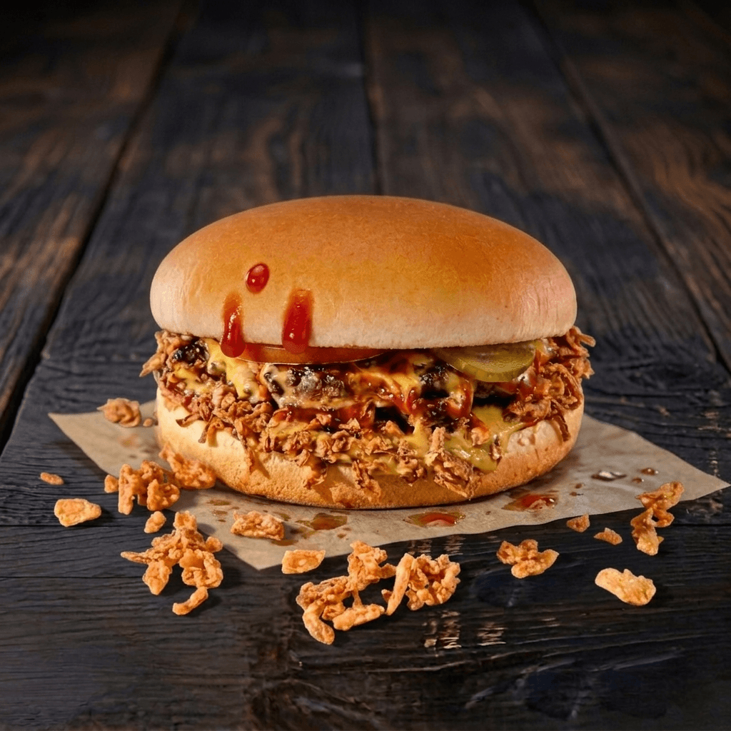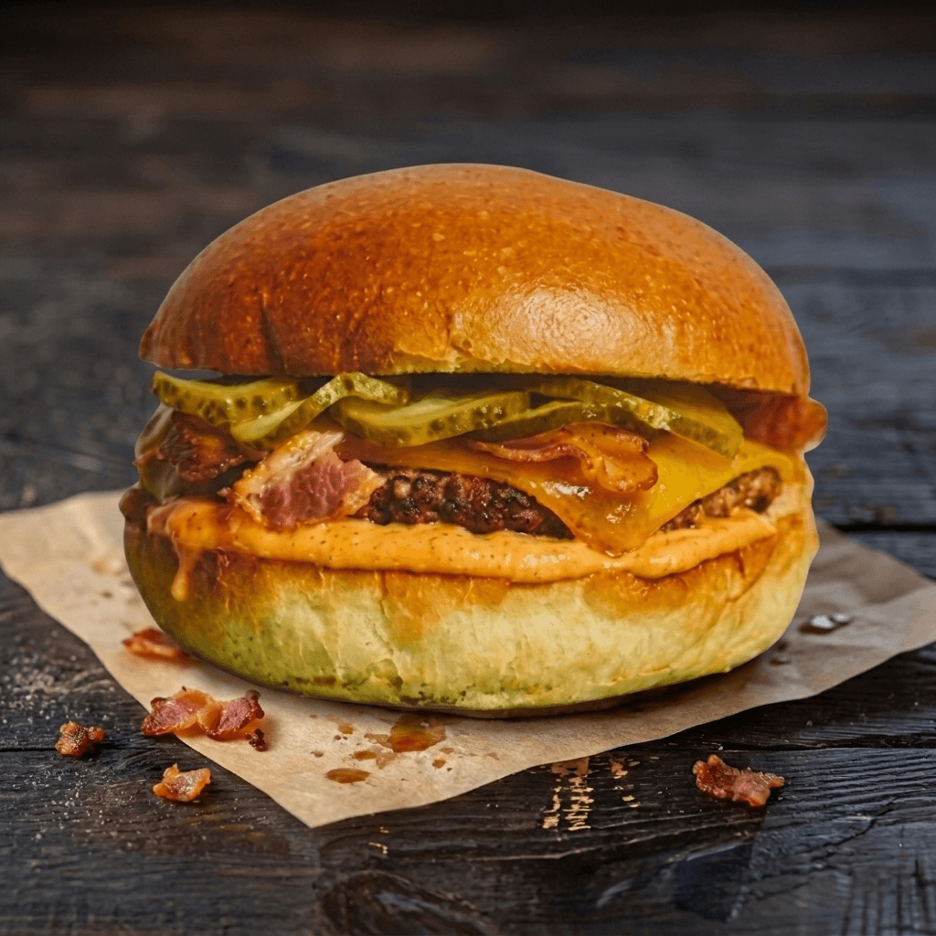 Brioche Bolli, Hakkibúffur 200gr, Cheddarostur, Bacon, Karameliseraður leykur, Súltað agurk, Dressingur & Rustic kips