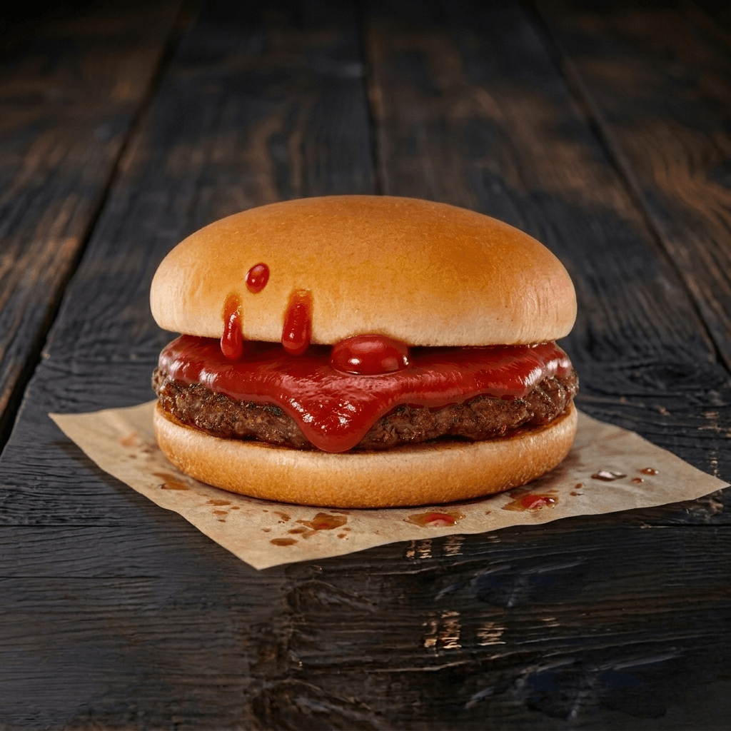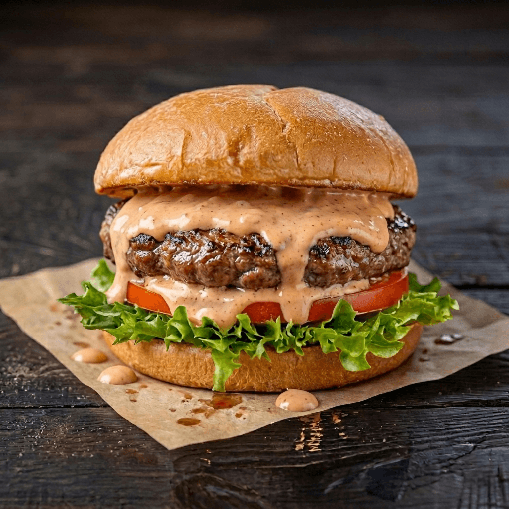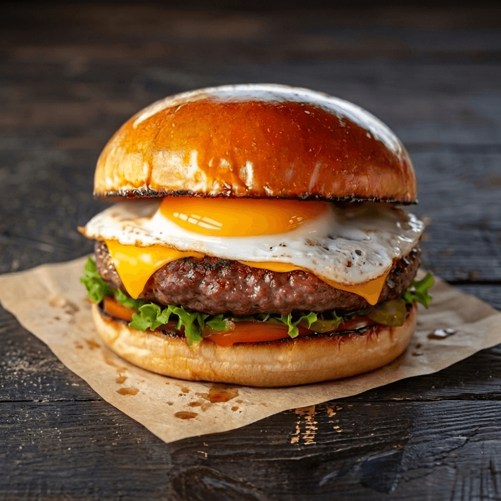 Brioche Bolli, Hakkibúffur 200gr, Cheddarostur, Bacon, Karameliseraður leykur, Súltað agurk, Dressingur & Rustic kips