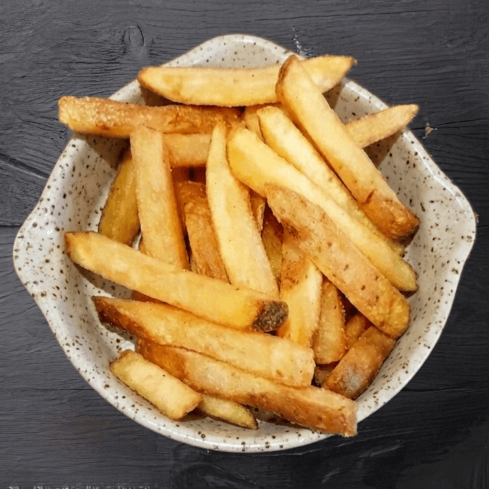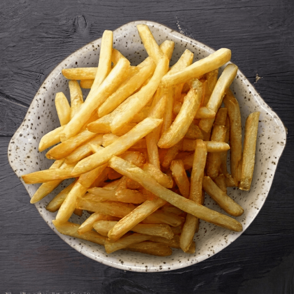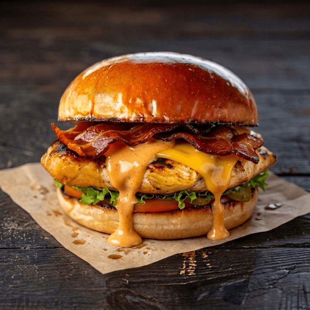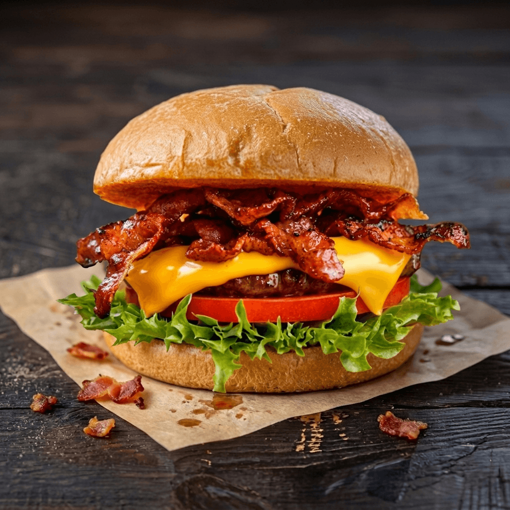 Brioche Bolli, Hakkibúffur 200gr, Cheddarostur, Bacon, Tomato, Agurk, Leykur, Dressingur & Rustic Kips.