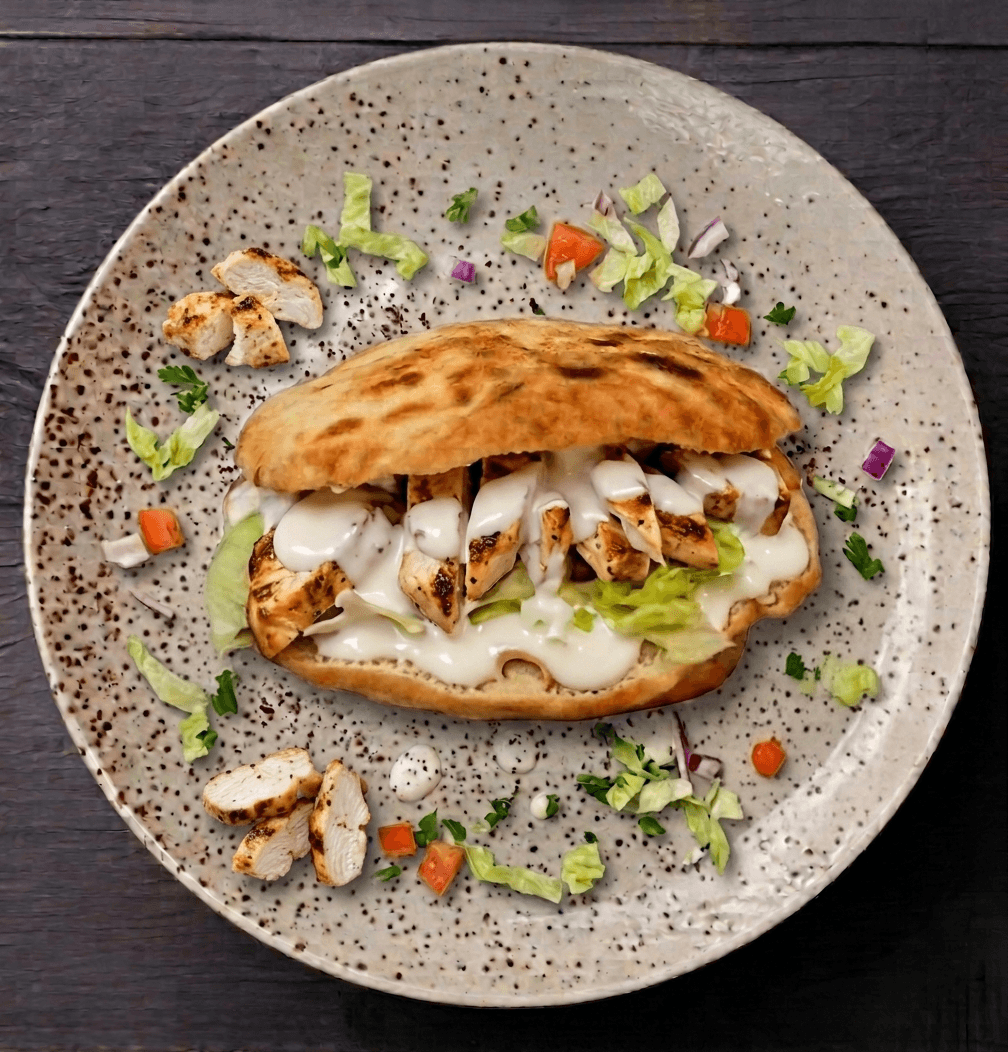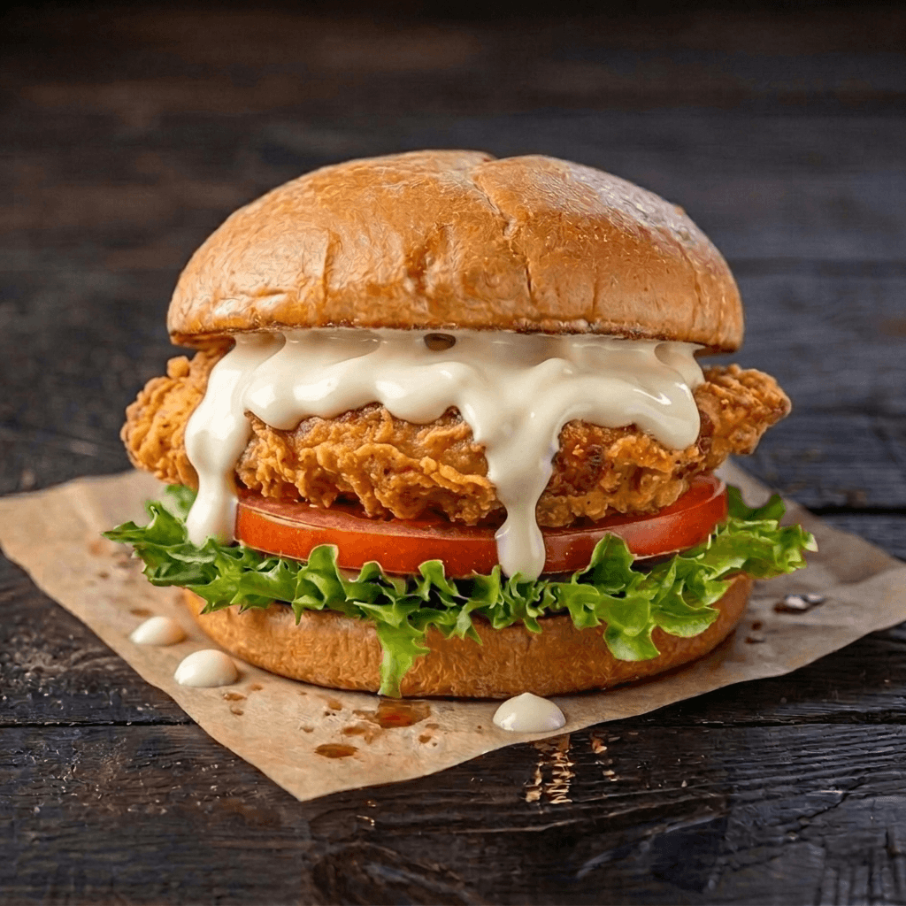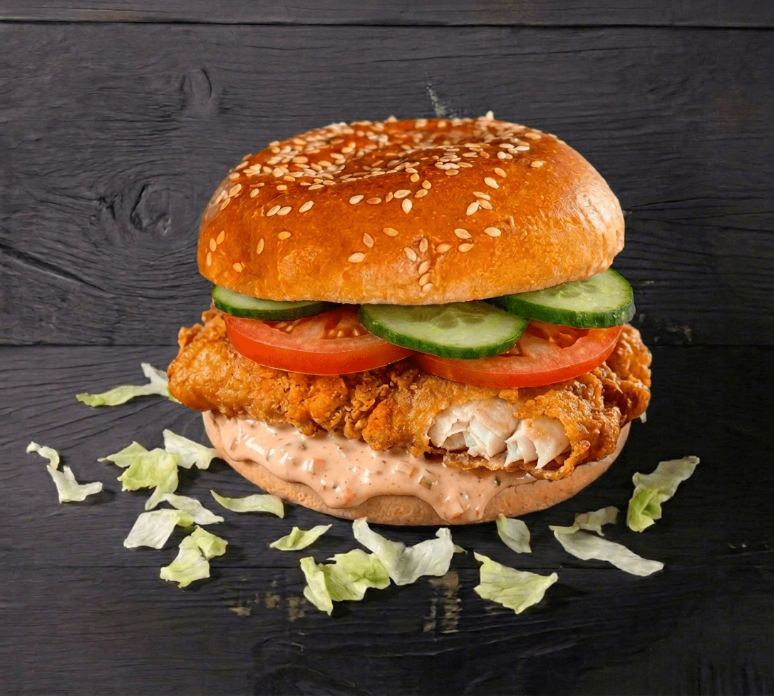 Brioche Bolli, Crunchy Chicken, Salat, Tomat, Agurk, Majo & Kips.