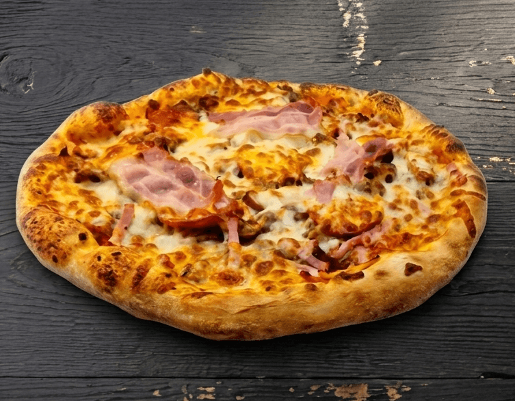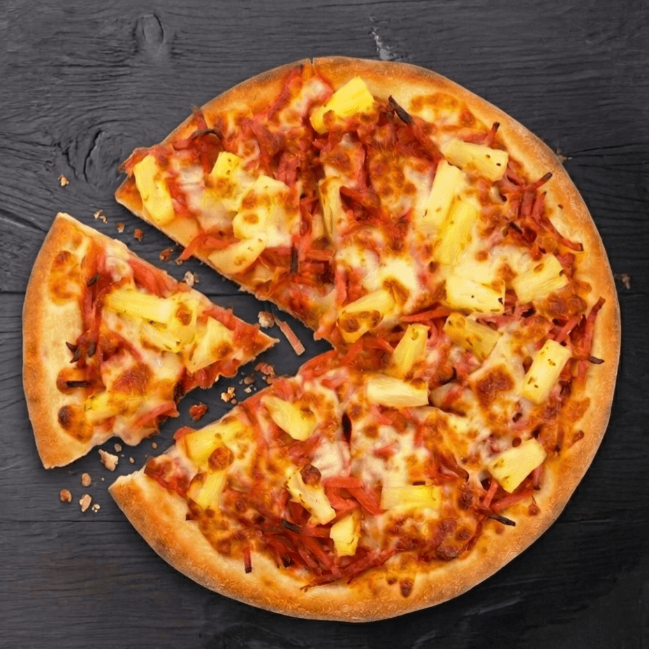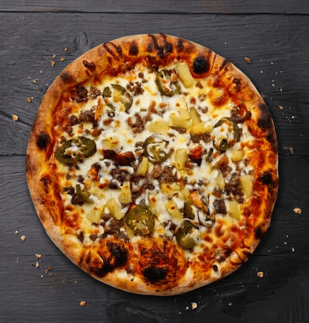 Ost, Tomatsós, Oksakjøt, Pepperoni, Skinka, Ananas, Piparfrukt, Soppar, Leykur.